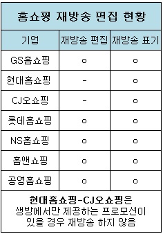 현대홈쇼핑과 CJ오쇼핑은 재방송 편집을 하지 않는다. 다만 양사는 모니터링을 통해 소비자가 오해할 여지가 있는 표현이 포함된 경우 재방송 대상에서 아예 제외하고 있다고 밝혔다.