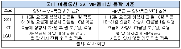 SK텔레콤과 KT, LG유플러스 등 국내 이동통신3사의 VIP멤버십 운영방식이 도마에 올랐다. 요금제 축소에 따른 멤버십 등급 하락은 거의 바로 이루어지는 반면 승급에는 2개월 가까이 걸리는 등 차이가 크기 때문이다.
