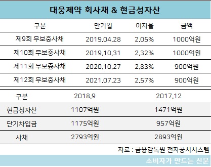 올해 만기도래하는 회사채 규모는 대웅제약이 보유한 현금보다 크다. 당장 벌어서 갚거나 회사채 상환을 위해 또 다른 사채를 끌어와야 한다는 의미다. 실제로 대웅제약은 지난해 7월 만기된 회사채 1000억 원을 갚기 위해 그해 6월 900억 원 공모채를 발행했다. 이자율은 2.07%에서 2.57%로 높아졌다.