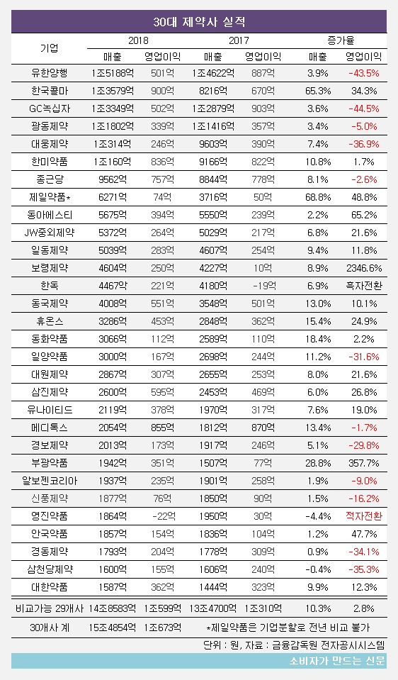 금융감독원 전자공시시스템에 따르면 30대 제약사는 지난해 15조4854억 원의 매출과 1조673억 원의 영업이익을 기록했다. 평균 영업이익률은 7.1%다. 기업분할로 전년과 비교가 어려운 제일약품을 제외하면 증가율은 매출이 10.3%, 영업이익은 3%다.