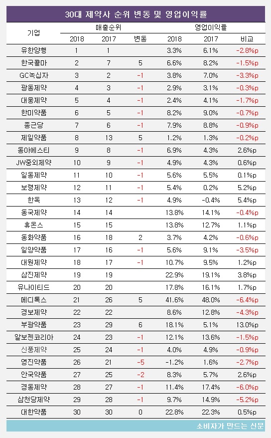 매출은 유한양행이 유일하게 1조5000억 원 이상을 기록하며 1위를 차지했다. 한국콜마, GC녹십자(대표 허은철), 광동제약(대표 최성원), 대웅제약(대표 전승호), 한미약품(대표 우종수·권세창)도 1조 원 이상의 매출을 올렸다. 한국콜마는 CJ헬스케어를 인수한 덕에 매출과 영업이익이 65.3%, 34.3% 급증했다.