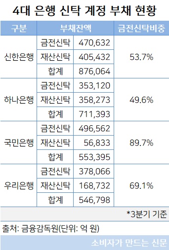 4대 은행의 경우 올해 3분기 기준 전체 신탁에서 금전신탁이 차지하는 비중과 규모는 신한은행 53.7%(47조632억 원), 하나은행 49.6%(35조3120억 원), 국민은행 89.7%(49조6562억 원), 우리은행 69.1%(37조8066억 원)이다.