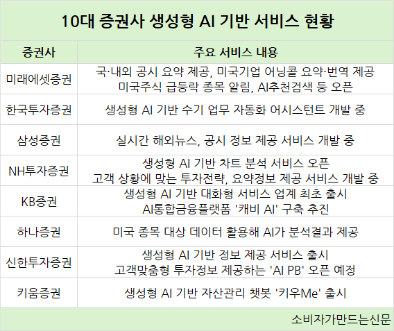 자기자본 기준 10대 증권사 가운데 미래에셋증권(대표 김미섭·허선호)이 생성형 AI를 통한 투자정보 제공, 검색 편의성 개선에 나선 가운데 KB증권(대표 김성현·이홍구)은 AI통합금융플랫폼을 구축하며 두각을 나타내고 있다.