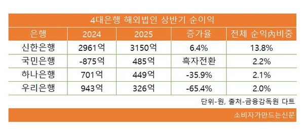 국민은행 5개 해외법인은 485억 원으로 흑자전환했다. 인도네시아의 KB뱅크(옛 부코핀은행)가 상반기 누적 808억 원의 순손실을 기록했지만 캄보디아의 KB프라삭은행이 1118억 원의 순이익을 내며 손해를 메웠다.