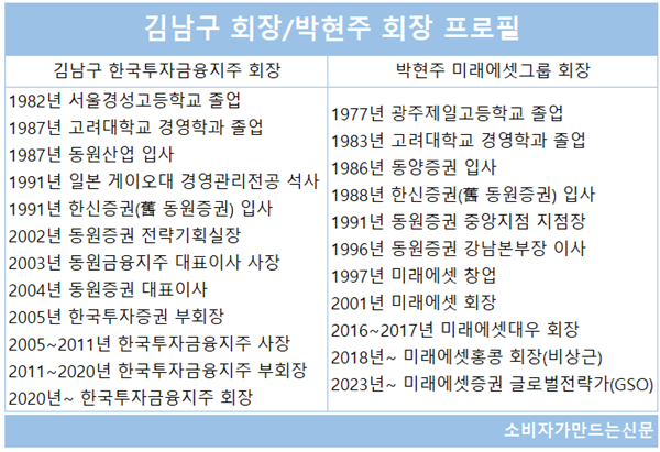 농부의 아들로 자수성가한 박현주 회장에게는 ‘샐러리맨 신화’ ‘개척자’ ‘혁신가’ 등의 수식어가 따른다. 이에 비해 대기업 오너의 장남으로 태어나 가업을 승계한 김남구 회장은 '책 읽는 CEO' '전략가' '안정적 리더십' 같은 정적인 이미지가 앞선다.