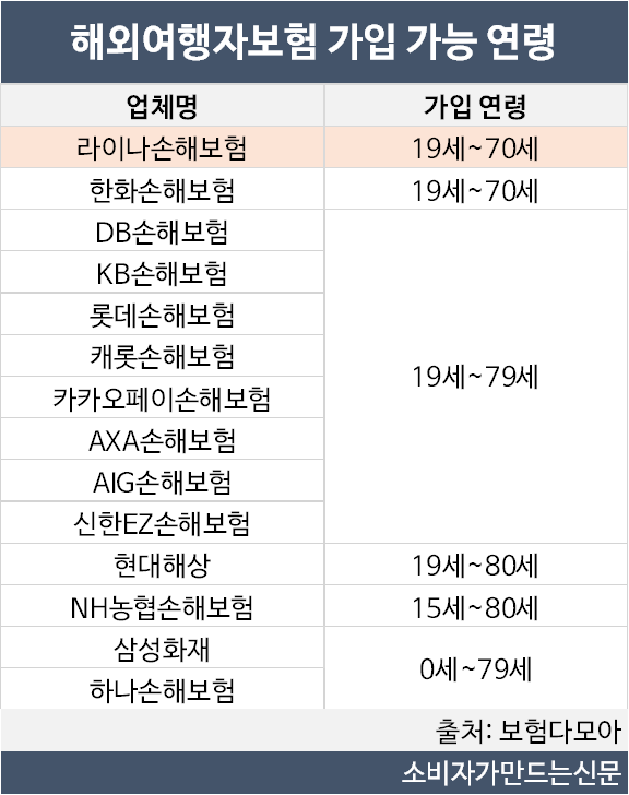 10일 온라인으로 해외여행자보험을 판매하는 14개 보험사 중 라이나손해보험 가입 연령 폭이 가장 좁았다. 19세부터 70세까지 가입이 가능했지만 71세부터는 불가능했다.