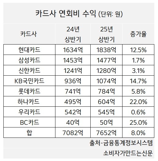 13일 금융통계정보시스템에 따르면 올해 상반기 카드사 8곳의 연회비 수익은 7652억 원으로 전년 대비 8% 증가했다.