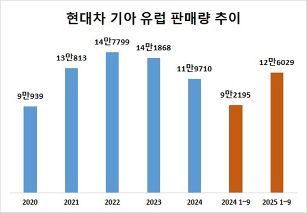 현대차와 기아의 유럽 전기차 판매량은 지난 2022년 14만7799대를 기록하며 역대 최대치를 기록한 이후 2023년 14만1868대, 2024년 11만9710대를 기록하며 매년 감소했다.