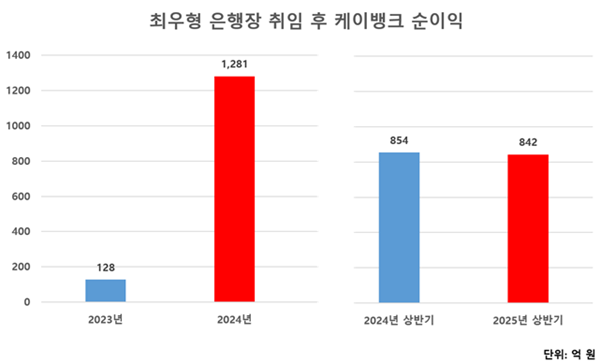지난해 1월 임기 2년 은행장으로 취임한 최 행장은 취임 첫 해 당기순이익 1281억 원을 기록하며 역대 최대 실적을 달성하는 성과를 거뒀다. 직전년도 충당금 적립 여파도 연간 당기순이익이 128억 원에 불과했지만 취임 첫 해 순이익이 10배 이상 급증한 셈이다.