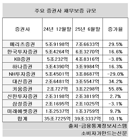 17일 금융감독원 금융통계정보시스템에 따르면 올해 상반기 국내 10대 증권사의 채무보증규모는 39조3337억 원으로 전년 말 대비 10.1% 증가했다.