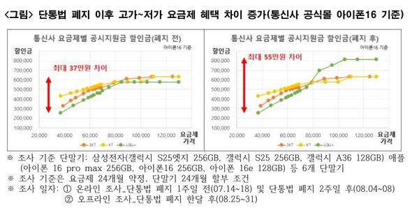 조사에 따르면 단통법 폐지 이후 공시지원금과 단말기 추가할인은 모두 증가했으나, 고가요금제의 증가 폭이 월등히 컸다. 공시지원금은 고가요금제 기준 최대 23만 원 늘었지만 중저가요금제는 거의 변동이 없었다.