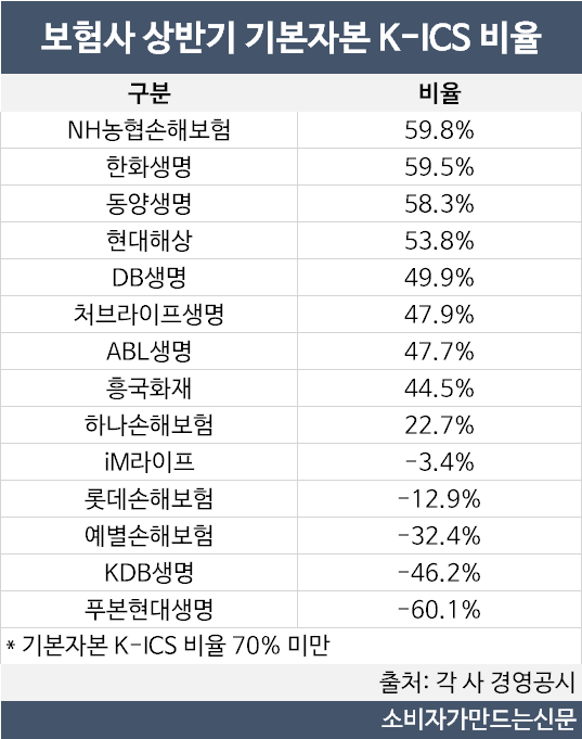 지난 6월 말 기준 기본자본비율이 70% 이하인 보험사는 총 14곳으로 이 중에서 올 들어 자본확충에 나선 곳은 한화생명, 현대해상, 농협손해보험 등 10곳이다.