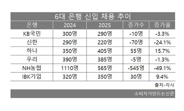 농협은행은 올해 하반기 공채만 실시하면서 연간 선발인원이 565명으로 전년 1110명 대비 반토막 수준으로 줄었고 신한은행도 70명이 감소했다. 국민은행과 우리은행도 각각 10명, 5명싹 채용 인원이 감소했다.