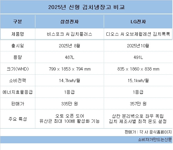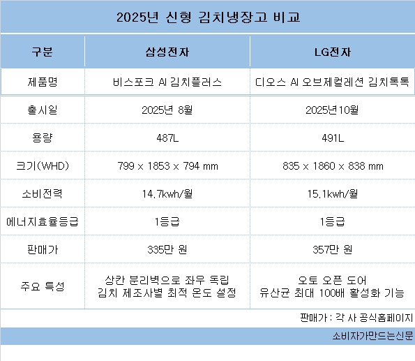 LG전자의 디오스 오브제컬렉션 김치톡톡 공식 판매가는 약 357만 원, 삼성전자의 비스포크 김치플러스의 공식 판매가는 335만 원이다.