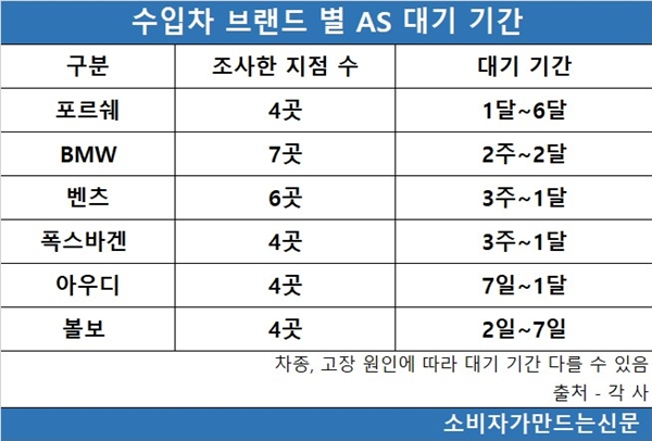 30일 소비자가만드는신문이 BMW, 벤츠, 아우디, 포르쉐, 볼보, 폭스바겐 등 6개 주요 수입차 서비스센터를 조사한 결과 볼보를 제외한 5개 업체의 예약 대기 기간이 한 달 이상인 것으로 확인됐다. 볼보는 7일 이내에 서비스센터 입고가 가능했다.