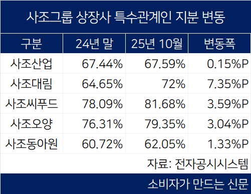 사조그룹 모든 상장사의 특수관계인 지분율이 높아진 것을 두고 일각에서는 지배구조 개선을 위한 사전작업에 나선 것 아니냐는 시각이 나온다.