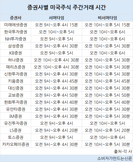미래에셋증권·한국투자증권·NH투자증권·삼성증권·KB증권·하나증권·메리츠증권·신한투자증권·키움증권·대신증권·교보증권·한화투자증권·유안타증권·iM증권·유진투자증권·LS증권·토스증권·카카오페이증권 등의 18개 증권사가 4일 오전부터 미국주식 주간거래를 다시 시작한다.