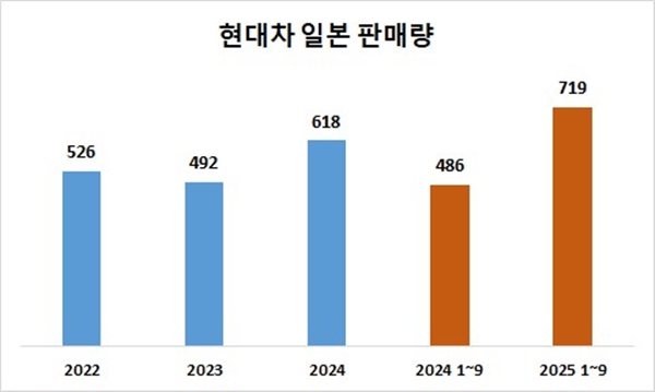 현대차의 일본 시장 연간 판매량은 ▲2022년 526대 ▲2023년 492대 ▲2024년 618대로 소폭 성장하고 있다.