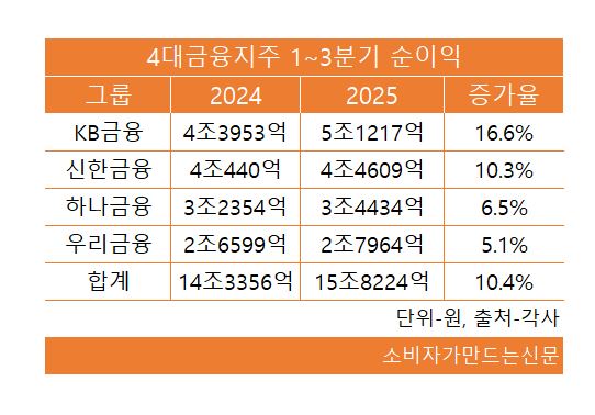 4대 금융지주 중에서 순이익이 가장 많으면서 순이익 증가율과 증가폭도 1위다. 이미 지난해 연간 순이익 5조286억 원을 3분기 만에 넘어선 호실적이다.