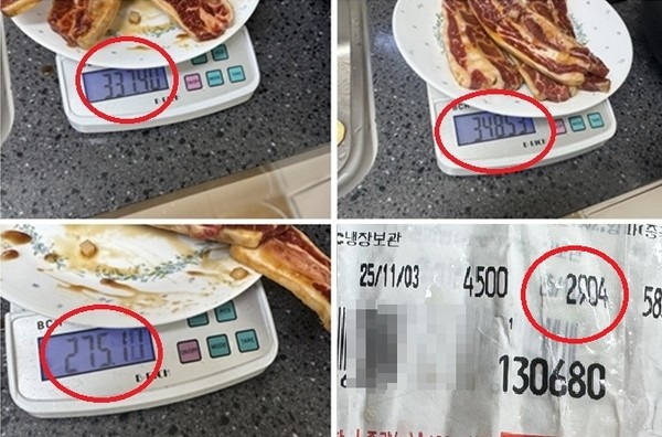 URL복사 기사공유하기 스크랩 프린트 메일보내기 글씨키우기 전북 군산시 수송동에 사는 서 모(여)씨는 대형마트에서 LA갈비 약 3kg를 13만 원에 구매했지만 집에 와서 무개를 재보니 고기는 1kg도 안 된다며 황당해했다. 실제로 서 씨가 첨부한 사진에 따르면 LA갈비만 무게를 쟀을 때 중량의 합은 960g을 겨우 넘겼다. 나머지 약 2kg은 모두 양념인 셈이다. 서 씨는 "고기를 산 건지 양념을 산 건지 모르겠다"며 "이런 식으로 기만하는 게 괘씸하다"고 분노했다. [소비자가만드는신문=정은영 기자] 저작권자 © 소비자가 만드는 신문 무단전재 및 재배포 금지 정은영 기자 다른기사 보기 URL복사 기사공유하기 주요기사 미래에셋증권 "IMA 인가 실사 완료, 정부기조 맞춰 모험자산 투자 확대할 것” F&F 세르지오 타키니, '일상 속 웰니스' 25FW 프리미엄 패딩 컬렉션 선보여 미래에셋증권 3분기 누적 순이익 1조79억 원... 전년 동기 대비 52.3% 증가 한진, 인플루언서 맞춤 물류 솔루션 ‘원스타’ 론칭…SNS 인증으로 간편 가입 유한킴벌리, ‘크리넥스 밤부케어’ 매출 1% 녹색 인프라 구축 기금으로 출연 삼성전자, 유럽 최대 공조기기 업체 플랙트 인수…AI 플랫폼 결합해 미래 먹거리로 키운다