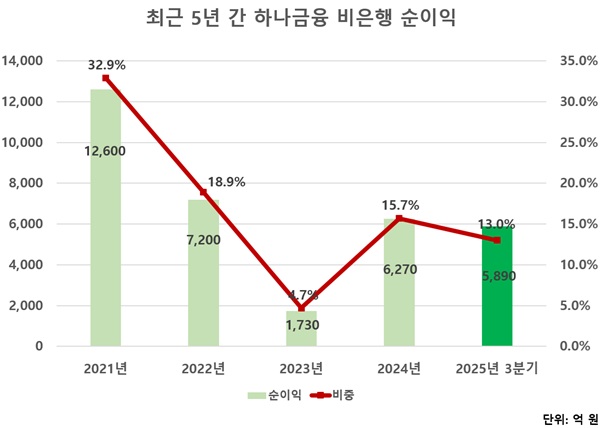 하나은행은 역대 최대 실적을 달성했지만 하나증권과 하나카드 등 비은행 계열사의 수익성 회복이 어려운 상황이다.