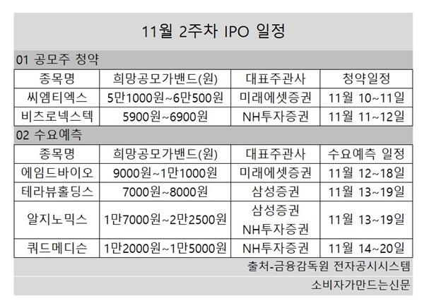 11월 둘째 주에는 씨엠티엑스와 비츠로넥스텍이 공모청약에 나선다. 에임드바이오, 테라뷰홀딩스, 알지노믹스, 쿼드메디슨은 수요예측을 진행한다.