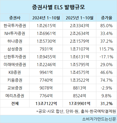 7일 한국예탁결제원에 따르면 올해 10월까지 증권사 ELS 발행규모는 총 17조9901억 원으로 전년 동기 대비 31.2% 증가해 이미 2024년 전체 발행규모 16조743억 원을 넘어섰다.