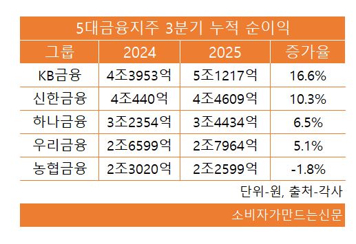 특히 금융지주 4위 자리를 두고 경쟁하는 우리금융지주가 2조7964억 원을 기록하며 농협금융은 약 5400억 원 차이로 벌어졌다.