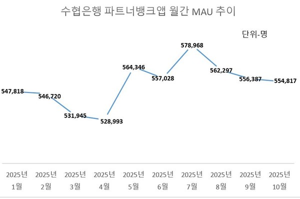 다만 아직 큰 효과는 보지 못하고 있다. 모바일인덱스에 따르면 지난달 수협은행 파트너뱅크 앱 월간 활성화이용자수(MAU)는 55만4817명으로 연초 54만7818명보다 약 7000여 명 늘어나는데 그쳤다.