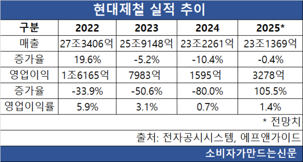 철강 업계가 다운사이클로 장기간 침체를 이어가는 가운데 현대제철은 2021년부터 지난해까지 4년 연속 영업이익이 감소했다.