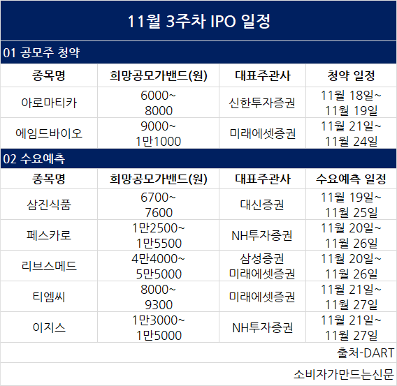 바이오테크 기업인 에임드바이오는 11월 21일과 24일에 공모청약을 시작한다. 공모희망가는 9000~1만1000원으로 20일 공모가액이 확정된다. 대표주관사는 미래에셋증권이다.