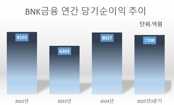 하지만 2024년 8027억 원으로 순익을 회복한 데 이어 올해는 3분기 기준 7700억 원의 순이익을 달성해 연간 역대 최대 실적이 유력하다. 기업회생 절차에 들어간 삼정기업 관련 대손충당금이라는 일회성 요인이 포함됐고 비이자이익이 개선되면서 3분기 기준으로 이미 역대 최대다.