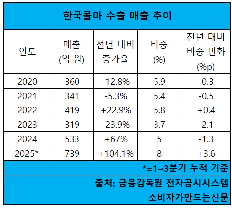 한국콜마의 수출 매출은 2020~2021년 감소세를 보이다가 2022년 반등했고 2023년 다시 크게 꺾였지만 올해 완전히 흐름을 뒤집었다. 지난해 전년 대비 67% 증가한 533억 원으로 회복세를 보인 데 이어 올해는 3분기 만에 700억 원을 넘어서는 이례적 성장세를 기록했다.
