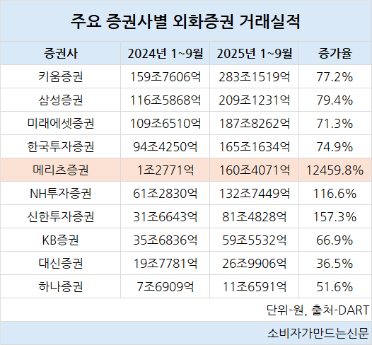메리츠증권의 위탁매매 관련 외화증권 거래실적은 지난해 3분기 1조2771억 원이었으나 올해 3분기는 160조4071억 원으로 전년 동기 대비 약 126배 늘었다.