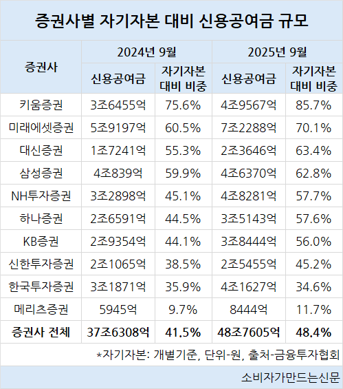 25일 금융투자협회에 따르면 올해 9월 국내 60개 증권사의 신용공여금은 총 48조7605억 원으로 전년 동기 대비 29.6% 증가했다. 자기자본 대비 한도도 48.4%로 6.9%포인트 올랐다.