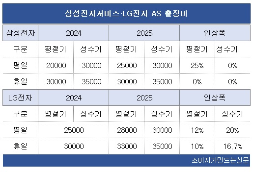 삼성전자서비스는 지난 4월 출장비를 인상하며 평절기 평일 요금만 2만 원에서 2만5000원으로 25%(5000원) 인상했다. 성수기 출장비는 지난해 7월 인상한 이후 동일하게 유지되고 있다. 평일 3만 원, 야간 및 휴일은 3만5000원이다.