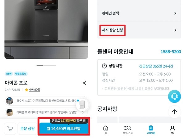 쿠쿠홈시스와 현대큐밍은 앱 내에 렌탈 해지 신청 버튼조차 따로 마련돼 있지 않다. 상담사와 유선으로 연결하거나 카카오톡 등을 통해 해지 상담해야 한다.