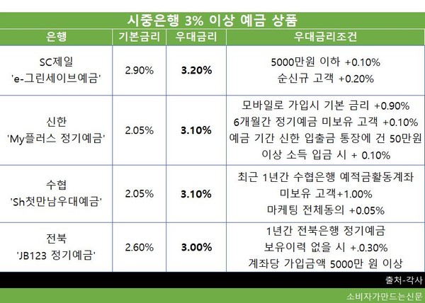 SC제일은행 'e-그린세이브예금'이 우대금리 포함 연 3.2%로 가장 높았고 신한은행 'My플러스 정기예금'과 수협은행 'Sh첫만남우대예금'이 연 3.1%로 뒤를 이었다.