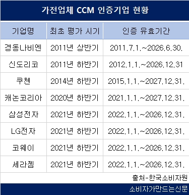 삼성전자와 LG전자, 코웨이, 세라젬 등 주요 가전렌탈업체들도 5년째 CCM 인증을 유지하고 있다. 캐논코리아는 2021년부터 2027년 말까지 7년간 CCM 인증이 유지된다.