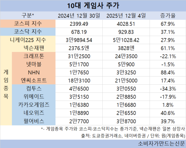 엔씨소프트는 올해 주가가 17.4% 올랐지만 코스피 지수 상승폭에는 절반도 미치지 못했다. 크래프톤과 컴투스, 위메이드, 넷마블은 올해 들어 주가가 떨어졌다.