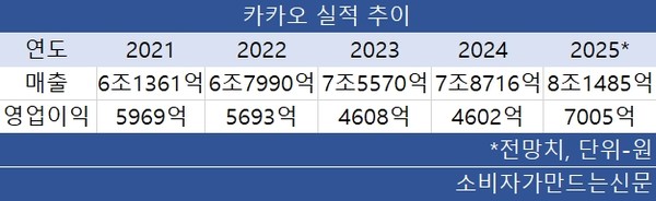 카카오는 올해 연매출 8조1485억 원, 영업이익 7005억 원을 기록할 전망이다. 정 대표가 취임하기 직전인 2023년 대비 7.3%, 34.2% 늘어난 수치다.