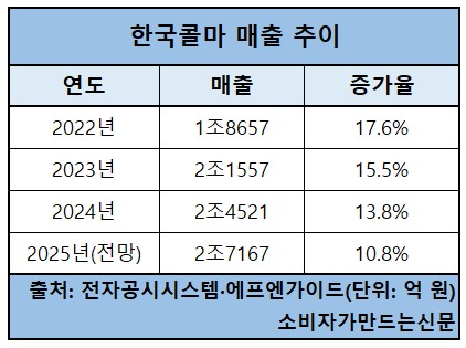 5일 전자공시시스템에 따르면 한국콜마 연결 기준 매출은 2022년 1조8657억 원, 2023년 2조1557억 원, 2024년 2조4521억 원을 기록했다. 올해는 2조7167억 원을 기록할 것으로 전망된다.