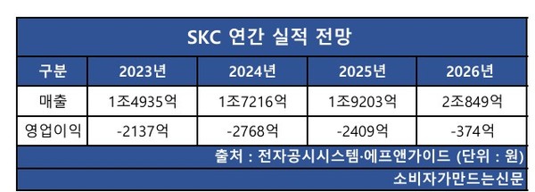 그러나 100%에 육박하는 매출 원가율이 지속되면서 SKC의 적자 규모는 2배 이상 커졌다. 2026년 역시 적자에서 탈출하기 어려울 것이란 전망이 나온다.
