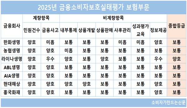 이 외에 ABL생명, AIA생명, 현대해상, 흥국화재 4곳은 종합등급 '보통'을 받았다.