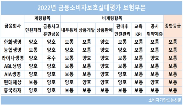 ABL생명과 AIA생명은 8개의 항목 중 '양호' 등급이 2개, '보통' 등급이 6개에 해당됐으며 현대해상은 8개 중 '양호' 등급 5개, '보통' 등급 3개를 받았다 흥국화재는 '양호' 등급 3개, '보통' 등급 5개를 받은 것으로 조사됐다.