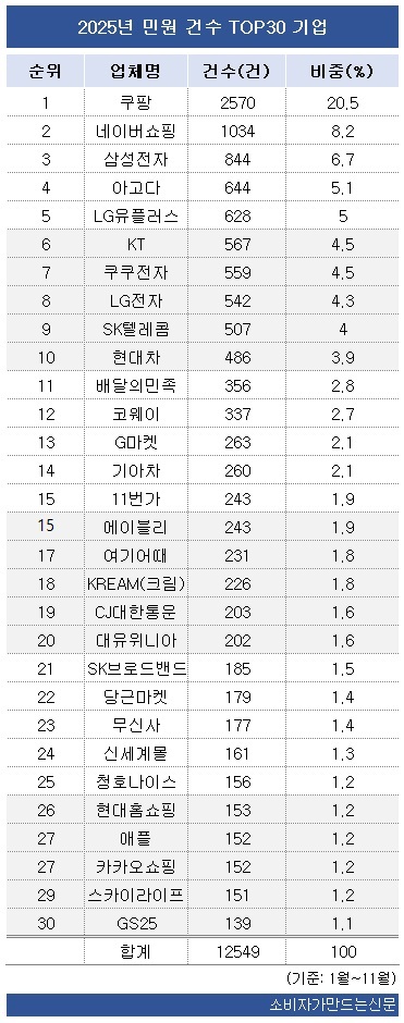 올해 1월1일부터 11월30일까지 소비자가만드는신문에 제기된 민원 건수 상위 30개 기업을 집계한 결과 ▶쿠팡이 1위로 조사됐다. 쿠팡은 올해 2570건의 민원이 제기되며 단일 기업으로는 유일하게 민원 비중 20%를 넘겼다.