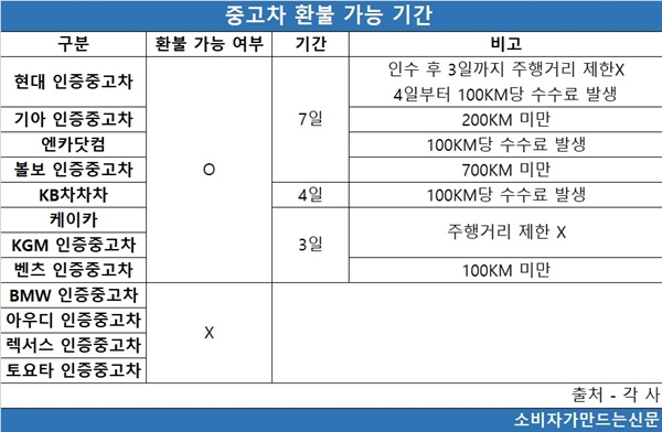 환불 제도를 둔 업체 중에서는 ▶현대·기아·볼보 인증중고차와 엔카닷컴이 환불 가능 기간을 7일로 정해 소비자에게 가장 유리한 기준을 적용하고 있다. ▶KB차차차는 4일 ▶벤츠·KGM 인증중고차와 케이카는 3일을 환불 기간으로 두고 있다.