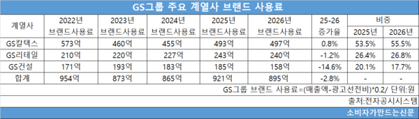 29일 전자공시시스템에 따르면 ㈜GS가 2026년 주요 계열사 3곳으로부터 받을 브랜드 사용료는 총 895억 원으로 집계됐다. 전년 대비 2.8% 감소했다. 4분기 매출이 내부 전망치를 상회할 경우 브랜드 사용료는 늘어날 수 있다.