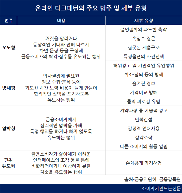 온라인 금융상품 다크패턴을 4개 범주, 15개 세부 유형으로 나눠 금지해 금융소비자의 결정이 왜곡·침해당하는 일을 최소화하겠다는 방침이다.