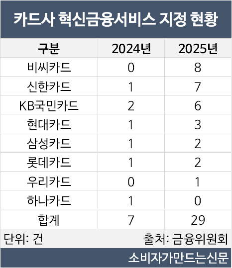 26일 금융위원회에 따르면 올해 카드사 혁신금융서비스 지정건수는 29건으로 지난해 7건 대비 4배 이상 늘었다.